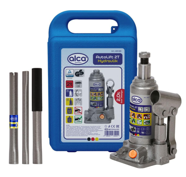 Υδραυλικός γρύλος μπουκάλας της ALCA ιδανικός για την ανύψωση αντικειμένων όπως αυτοκίνητα, με δυνατότητα ανύψωσης έως 31cm και μέγιστό βάρος 2 τόνους.
