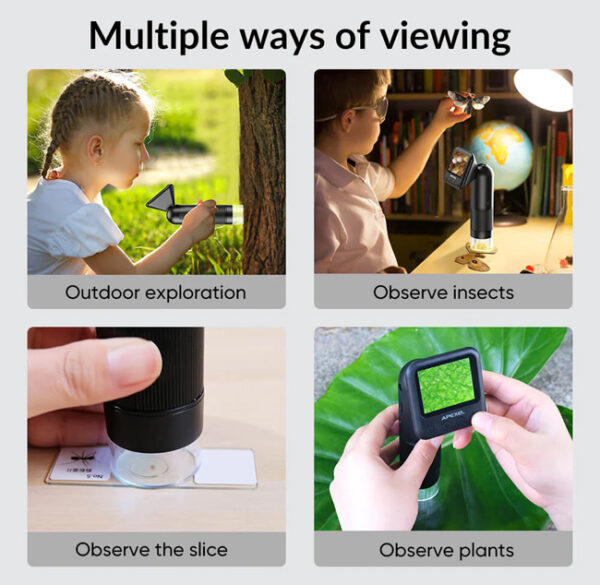 Φορητό, ψηφιακό μικροσκόπιο της Apexel με εμβέλεια zoom από 400x έως 800x. Είναι ιδανικό για την παρατήρηση μικρών αντικειμένων, εντόμων, φυτών κ.α.
