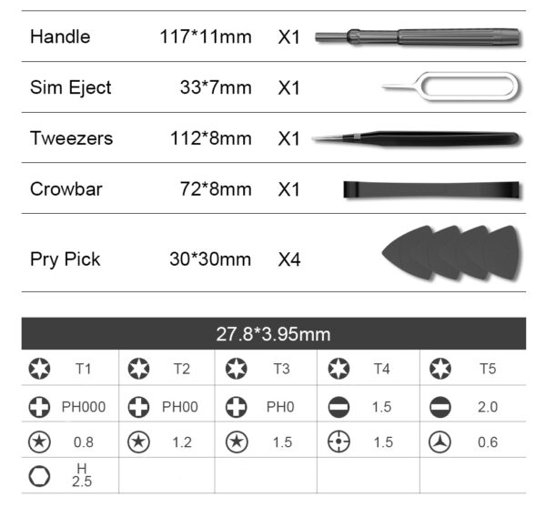 Σετ εργαλείων το οποίο αποτελείται από κατσαβίδια ακριβείας και άλλα χρήσιμα εργαλεία, όπως τσιμπίδα, pry pick, SIM needle και crowbar.
