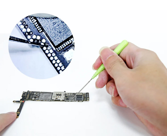 Εργαλείο κατάλληλο για γρήγορη συγκόλληση σημείου, ξύσιμο, καθαρισμό και άλλες εργασίες ακριβείας σε motherboard PCB κινητού τηλεφώνου. Η άκρη του εργαλείου είναι πολύ λεπτή και αιχμηρή. Η συσκευασία αποτελείται από 2 εργαλεία, 1 με ίσια μύτη και 1 με κυρτή μύτη.