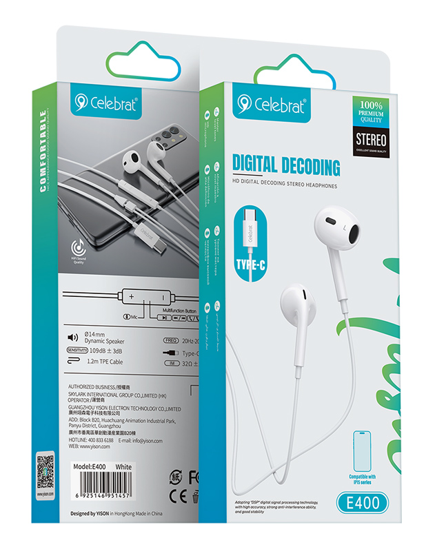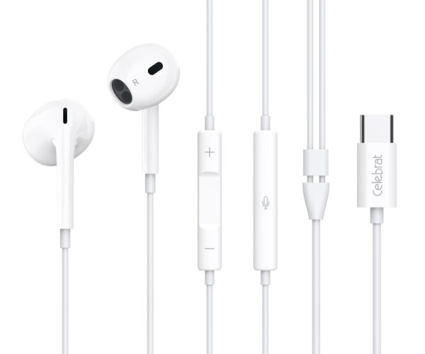 CELEBRAT earphones με μικρόφωνο E400, USB-C σύνδεση, Φ14mm, 1.2m, λευκά