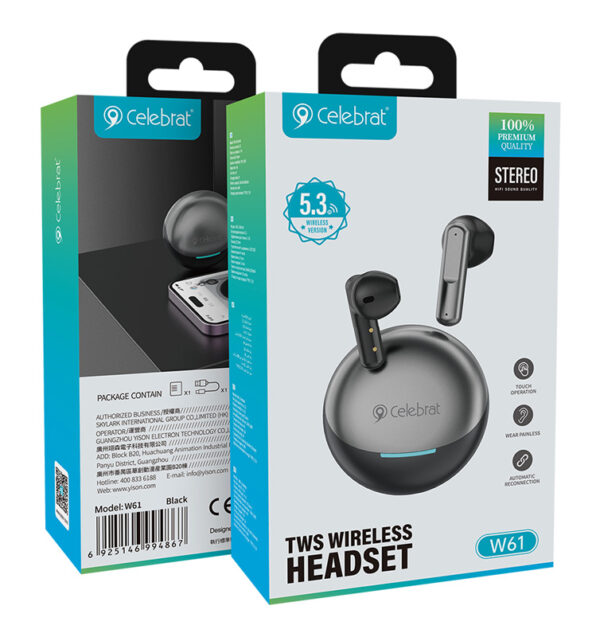 Τα true wireless earphones W61 της Celebrat προσφέρουν κορυφαία ποιότητα ήχου και άριστη εφαρμογή στο αυτί. Είναι συμβατά με tablets, smartphones και άλλες συσκευές που διαθέτουν Bluetooth.