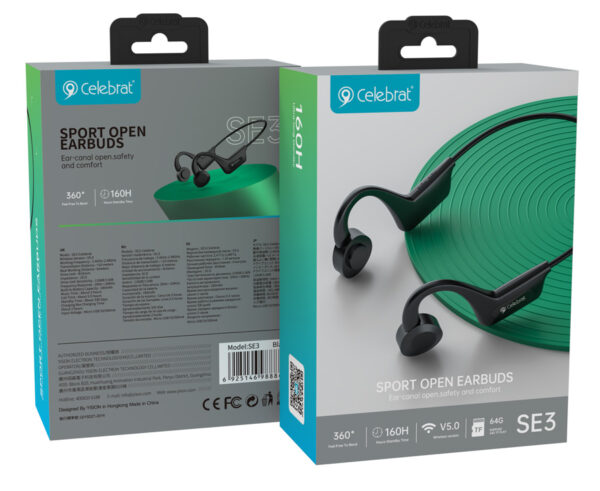 Τα ακουστικά SE3 της Celebrat προσφέρουν κορυφαία ποιότητα ήχου και άριστη εφαρμογή. Είναι συμβατά με tablets, smartphones και κάθε συσκευή που διαθέτει bluetooth. Με ενσωματωμένο μικρόφωνο υψηλής απόδοσης που επιτρέπει την πραγματοποίηση τηλεφωνικών κλήσεων. Μπορούν να φορεθούν εύκολα γύρο από το κεφάλι ενώ το ακουστικό χάρη στον open air σχεδιασμό του, δεν εφαρμόζει μέσα, άλλα μπροστά από το αυτί, μεταφέροντας τον ήχο μέσω του αέρα και διατηρώντας με αυτόν τον τρόπο ξεκούραστο το αυτί σας μετά από αρκετές ώρες χρήσης. Είναι ιδανικά για όσους χρειάζονται ένα ελαφρύ, κομψό και σταθερό ζευγάρι ακουστικών για να ακούνε μουσική και να πραγματοποιούν κλήσεις υψηλής ποιότητας κατά την άσκηση τους.