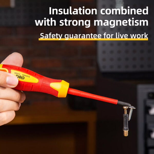 Σταυρωτό κατσαβίδι ηλεκτρολόγου από την Deli με πιστοποίηση VDE για αντοχή σε τάση 1000V. Η μύτη του κατσαβιδιού διαθέτει μαγνητική ιδιότητα ενώ η αντιολισθητική λαβή του προσφέρει άνετο κράτημα κατά την διάρκεια της εργασίας.
