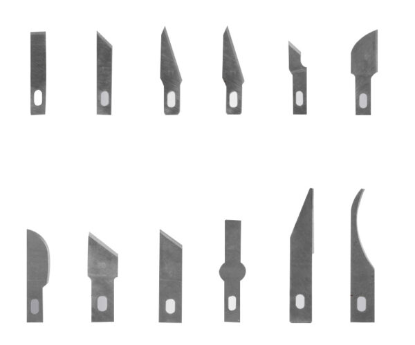 Το σετ περιλαμβάνει 2x κοπίδια, 12x λεπίδες σε διάφορα σχήματα, τσιμπίδα και κατσαβίδι ίσιο.