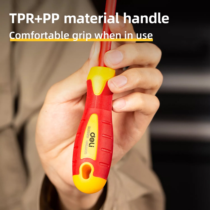 Σταυρωτό κατσαβίδι ηλεκτρολόγου από την Deli με πιστοποίηση VDE για αντοχή σε τάση 1000V. Η μύτη του κατσαβιδιού διαθέτει μαγνητική ιδιότητα ενώ η αντιολισθητική λαβή του προσφέρει άνετο κράτημα κατά την διάρκεια της εργασίας.