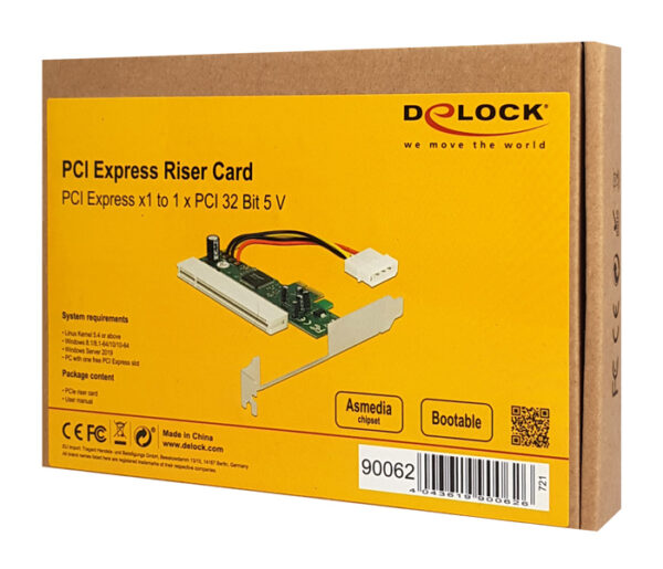 Η κάρτα επέκτασης PCI της Delock επιτρέπει τη σύνδεση μιας κάρτας PCI μέσω μιας διεπαφής PCI Express. Η εσοχή στην υποδοχή επιτρέπει μια εξωτερική σύνδεση π.χ. με καλώδια προς την ενσωματωμένη κάρτα PCI στη θήκη του υπολογιστή.