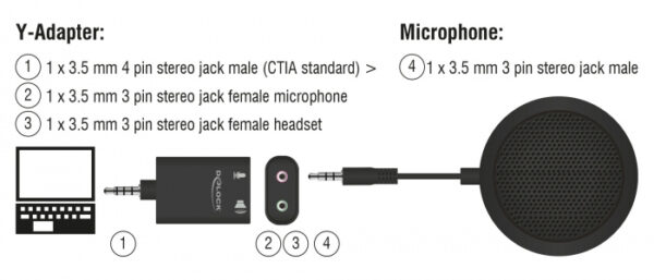 Y-Adapter: 1x 3.5mm 4 pin stereo jack male (CTIA standard) > 1x 3.5 mm 3 pin stereo jack female microphone, 1x 3.5mm 3 pin stereo jack female headset