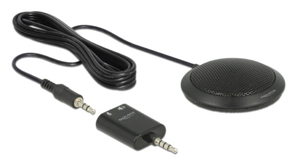 Επιτραπέζιο πυκνωτικό μικρόφωνο της Delock. Η υπερκατευθυντική και κωνική κατεύθυνσή του βεβαιώνει πως ο ήχος δεσμεύεται άριστα και γι’ αυτό διαθέτει μεγάλο εύρος και είναι κατάλληλο για καταγραφή συνεντεύξεων, συνεδρίων, διαλέξεων κτλ. Μπορεί να συνδεθεί σε οποιοδήποτε PC ή laptop μέσω της θύρας στερεοφωνικής υποδοχής των 3.5mm 3pin. Ο αντάπτορας Υ των 3.5mm 4pin που συμπεριλαμβάνεται επιτρέπει επίσης τη σύνδεση σε tablet ή smartphone.