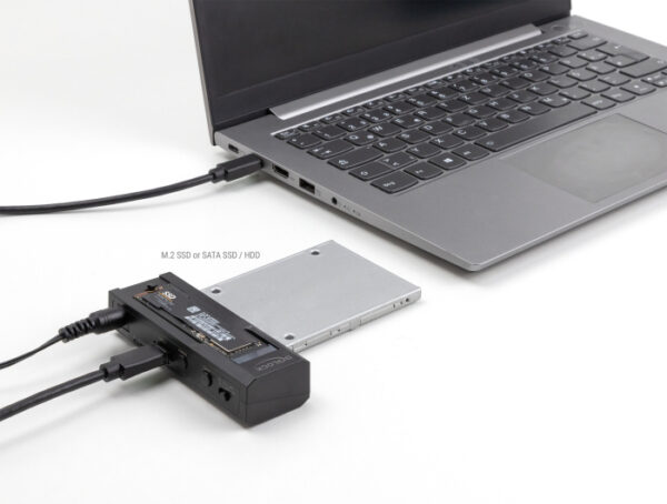 Αυτό το docking station της Delock επιτρέπει την σύνδεση ενός M.2 NVMe/SATA SSD (σε 2280, 2260, 2242 and 2230 format) ή ενός 2.5"/3.5" SSD/HDD σε ένα PC ή laptop μέσω θύρας USB ή USB-C (συμπεριλαμβάνονται καλώδια).