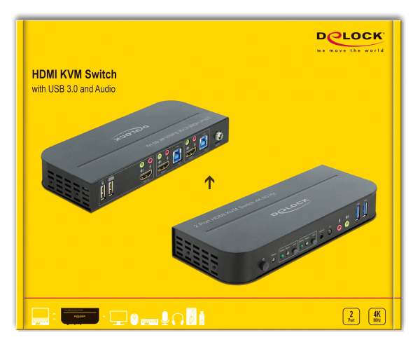 Το HDMI KVM Switch της Delock αποτελεί μια εύκολη λύση για τη σύνδεση δύο υπολογιστών με καλώδιο εξαγωγής HDMI σε μια οθόνη HDMI. Επιπλέον, διαθέτει δύο θύρες USB 2.0 για σύνδεση με ποντίκι και πληκτρολόγιο και δύο θύρες USB 3.0 για σύνδεση με σκληρό δίσκο ή κάρτα μνήμης USB. Ο ενεργός υπολογιστής μπορεί να επιλεχθεί με το ποντίκι, με το πληκτρολόγιο, με κουμπί στη συσκευή ή με τηλεχειριστήριο υπερύθρων.