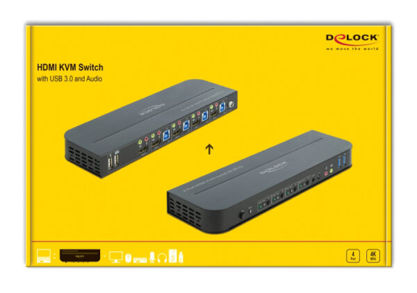 Το HDMI KVM Switch της Delock αποτελεί μια εύκολη λύση για τη σύνδεση 4 υπολογιστών με καλώδιο εξαγωγής HDMI σε μια οθόνη HDMI. Επιπλέον, διαθέτει 2 θύρες USB 2.0 για σύνδεση με ποντίκι και πληκτρολόγιο και 2 θύρες USB 3.0 για σύνδεση με σκληρό δίσκο ή κάρτα μνήμης USB. Ο ενεργός υπολογιστής μπορεί να επιλεχθεί με το ποντίκι, με το πληκτρολόγιο, με κουμπί στη συσκευή ή με τηλεχειριστήριο υπερύθρων.