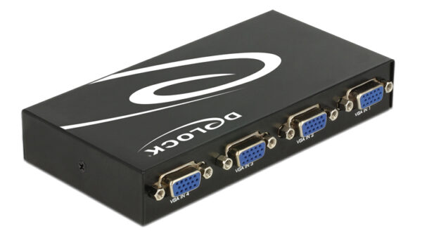 Bidirectional switch της Delock 4 θυρών, διπλής κατεύθυνσης για την σύνδεση συσκευών με θύρα VGA. Το switch καθιστά δυνατή την σύνδεση 4 συσκευών εικόνας με θύρα VGA σε ένα υπολογιστή ή 1 συσκευή εικόνας με θύρα VGA σε 4 υπολογιστές.