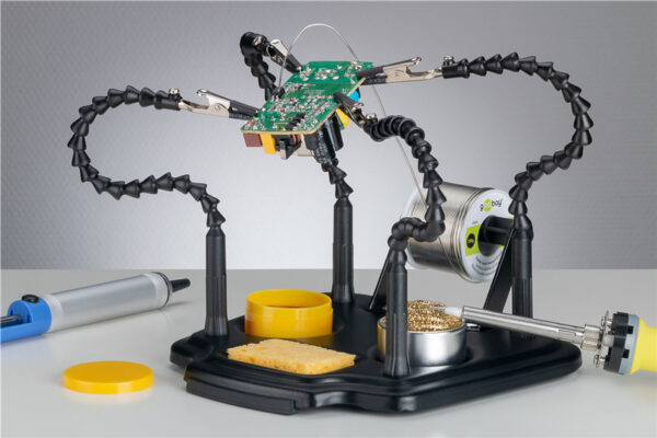 Βάση της Goobay για την στερέωση ηλεκτρονικών εξαρτημάτων όπως πλακέτες, κατάλληλη για εργασίες συγκόλλησης. Διαθέτει 4 εύκαμπτους βραχίονες με crocodile clips που προσφέρουν μεγαλύτερη ευελιξία κατά την εργασία. Το σώμα της βάσης είναι μεταλλικό, ενώ στο κάτω μέρος της διαθέτει αντιολισθητικά pads. Στην συσκευασία συμπεριλαμβάνεται σφουγγάρι, flux πάστα συγκόλλησης και συρμάτινο σφουγγάρι.