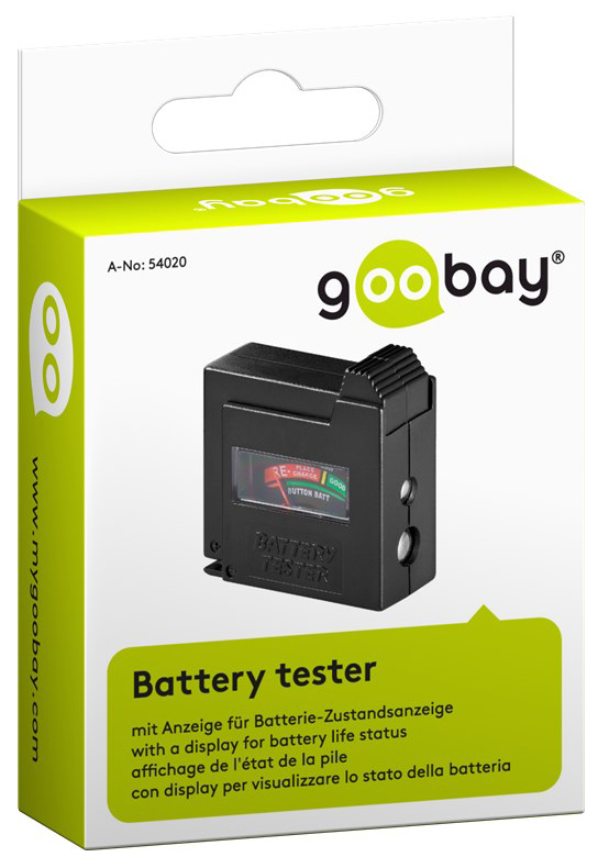 Battery tester της Goobay με ένδειξη της κατάστασης της μπαταρίας. Είναι συμβατό με μπαταρίες AAA (Micro), AA (Mignon), C (Baby), D (Mono), 9V Block, N (Lady).