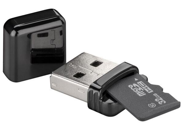 Card reader σε εξαιρετικά μικρό μέγεθος από την Goobay, με υποδοχή στην οποία μπορείτε να τοποθετήσετε μια micro SD κάρτα μνήμης. Συνδέεται απευθείας σε desktop ή laptop μέσω θύρας USB.