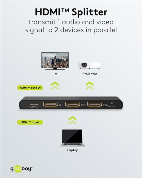 Το HDMI splitter της Goobay σας επιτρέπει την σύνδεση 1x συσκευής εισόδου όπως PC σε 2x συσκευών εξόδου όπως οθόνες.