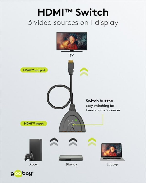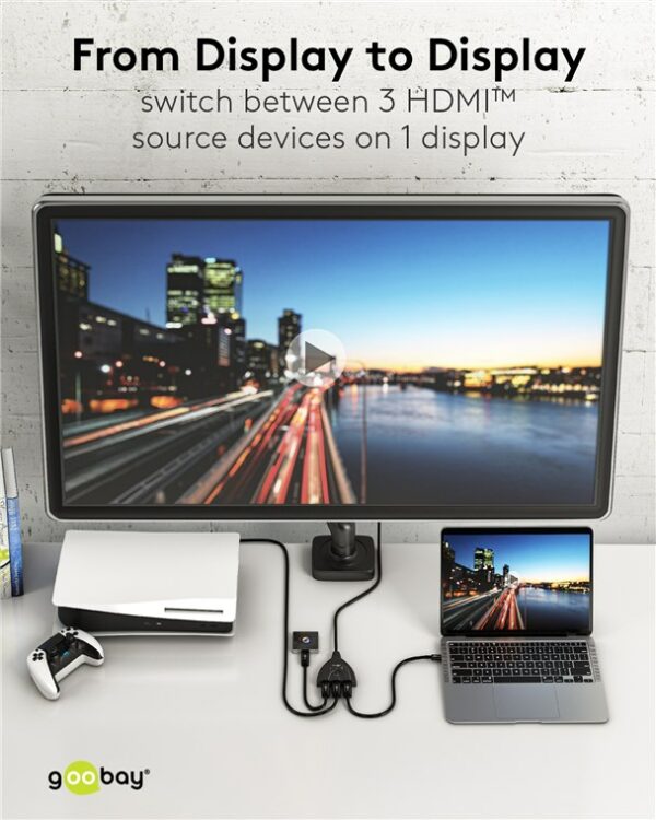 Το HDMI switch της Goobay σας επιτρέπει την εύκολη εναλλαγή μεταξύ 3x συσκευών εισόδου όπως PC ή gaming κονσόλες σε 1x συσκευή εξόδου όπως οθόνη ή τηλεόραση. Η εναλλαγή γίνεται μέσω πλήκτρου.