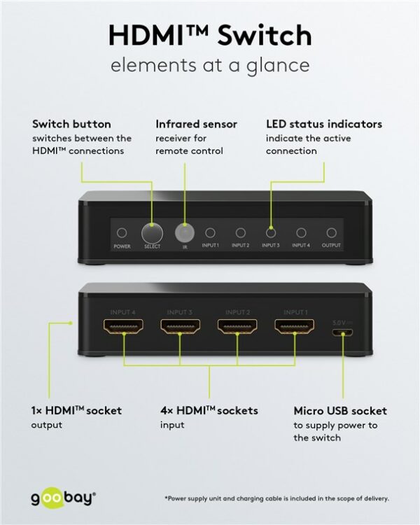 Το HDMI switch της Goobay σας επιτρέπει την εύκολη εναλλαγή μεταξύ 4x συσκευών εισόδου όπως PC ή gaming κονσόλες σε 1x συσκευή εξόδου όπως οθόνη ή τηλεόραση. Η εναλλαγή γίνεται μέσω πλήκτρου ή ασύρματου τηλεχειριστήριου το όποιο συμπεριλαμβάνεται στην συσκευασία.