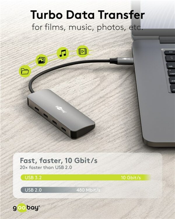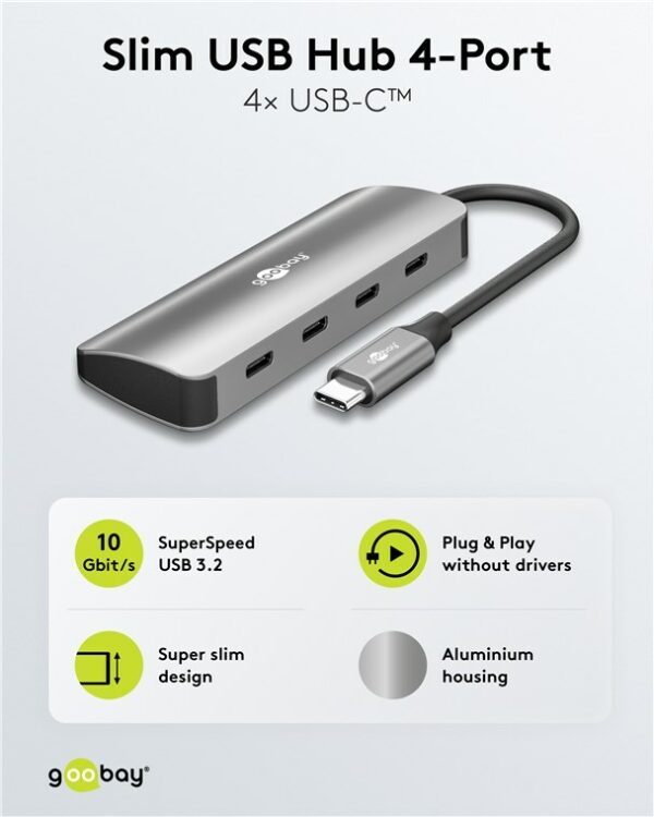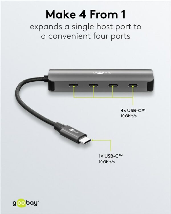 Αυτό το hub της Goobay μπορεί να συνδεθεί με το laptop ή το desktop σας μέσω θύρας USB-C και να επεκτείνει τις θύρες του με 4x USB-C θύρες. Διαφορετικές συσκευές USB, όπως εξωτερικοί σκληροί δίσκοι, card readers, ποντίκια κλπ. μπορούν να συνδεθούν μέσω του hub.