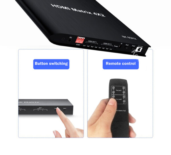 Το HDMI matrix switch σας επιτρέπει την εύκολη εναλλαγή μεταξύ 4x συσκευών εισόδου όπως PC ή gaming κονσόλες σε 2x συσκευών εξόδου όπως οθόνες ή τηλεοράσεις. Η εναλλαγή γίνεται μέσω πλήκτρου ή ασύρματου τηλεχειριστήριου το όποιο συμπεριλαμβάνεται στην συσκευασία.