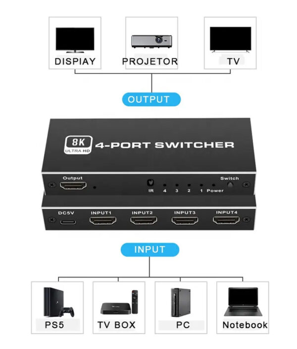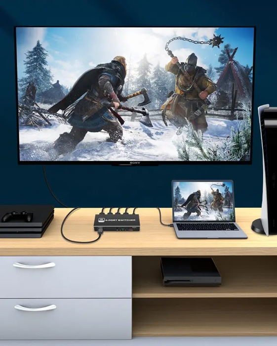 Το HDMI switch σας επιτρέπει την εύκολη εναλλαγή μεταξύ 4x συσκευών εισόδου όπως PC ή gaming κονσόλες σε 1x συσκευή εξόδου όπως οθόνες ή τηλεοράσεις. Η εναλλαγή γίνεται μέσω πλήκτρου ή ασύρματου τηλεχειριστήριου το όποιο συμπεριλαμβάνεται στην συσκευασία.