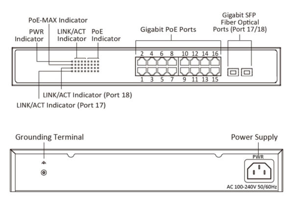 -16x gigabit PoE ports and 2x gigabit fiber optical ports