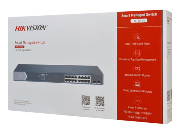 Το switch της Hikvision επεκτείνει το δίκτυο σας με 16x θύρες δικτύου PoE και 2x θύρες SFP με ταχύτητες 1000Mbps. Είναι ιδανικό για χρήση με συστήματα ασφαλείας, συναγερμούς, κάμερες κ.λπ.