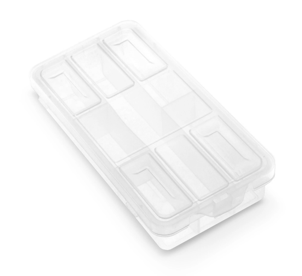 Πλαστική, διάφανη θήκη, με 6 εσωτερικές θέσεις, κατάλληλη για την αποθήκευση βιδών, καρφιών, παξιμαδιών, ασφαλειών ή άλλων μικρών εξαρτημάτων.