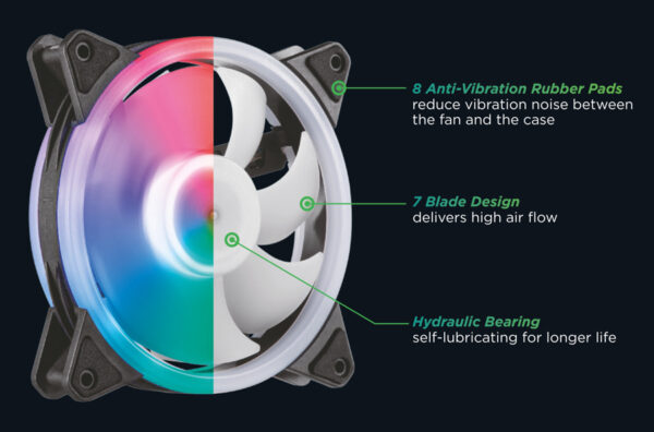 Ο ανεμιστήρας της Powertech προσφέρει υψηλής απόδοσης ψύξη και αθόρυβη λειτουργία. Εξοπλίζεται με κομψό RGB LED φωτισμό και από τις 2 πλευρές που προσδίδει μαγευτική εμφάνιση και αισθητική στο desktop σας.