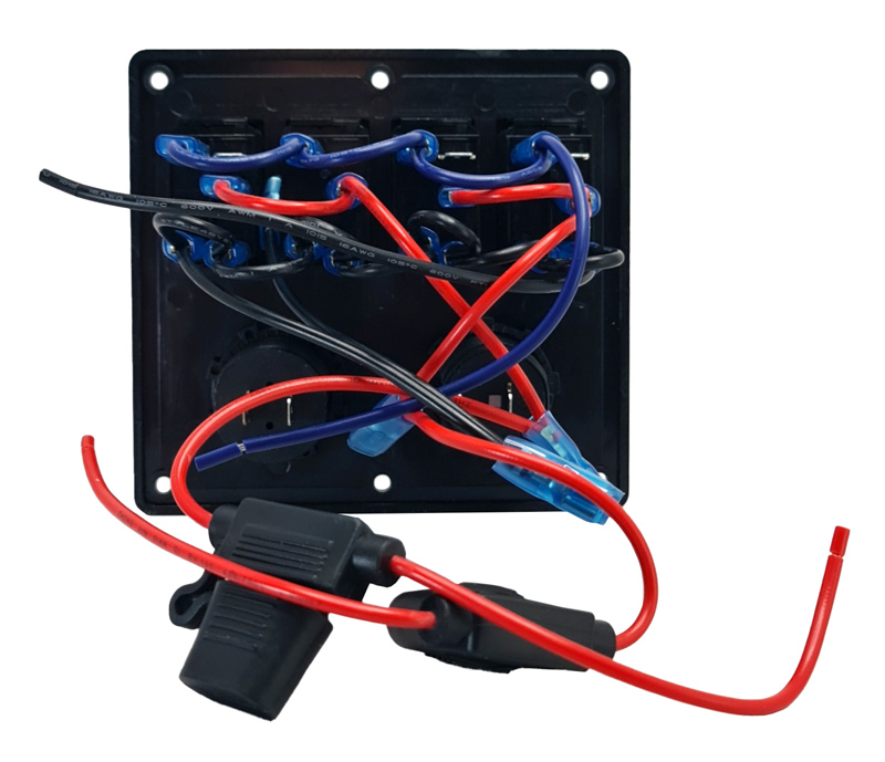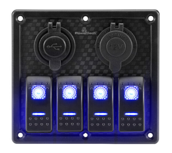 Πάνελ της Powertech, κατάλληλο για τοποθέτηση σε σκάφη και οχήματα όπως τρακτέρ κ.α. Εξοπλίζεται με υποδοχή αναπτήρα 12V, 2x θύρες φόρτισης USB και 4x φωτιζόμενους διακόπτες για σύνδεση με φώτα, κόρνα, υαλοκαθαριστήρες κ.λπ.