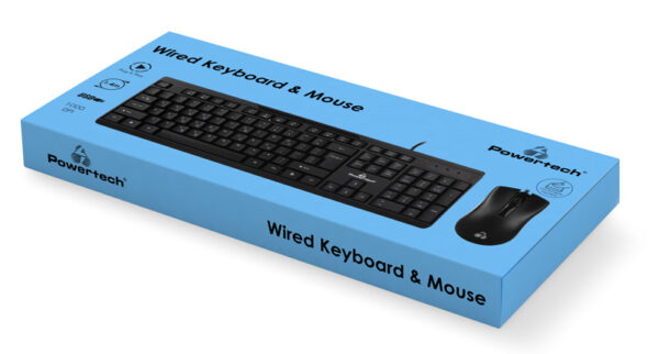 Set περιφερειακών για PC από την Powertech που αποτελείται από ενσύρματο πληκτρολόγιο και ενσύρματο οπτικό ποντίκι.