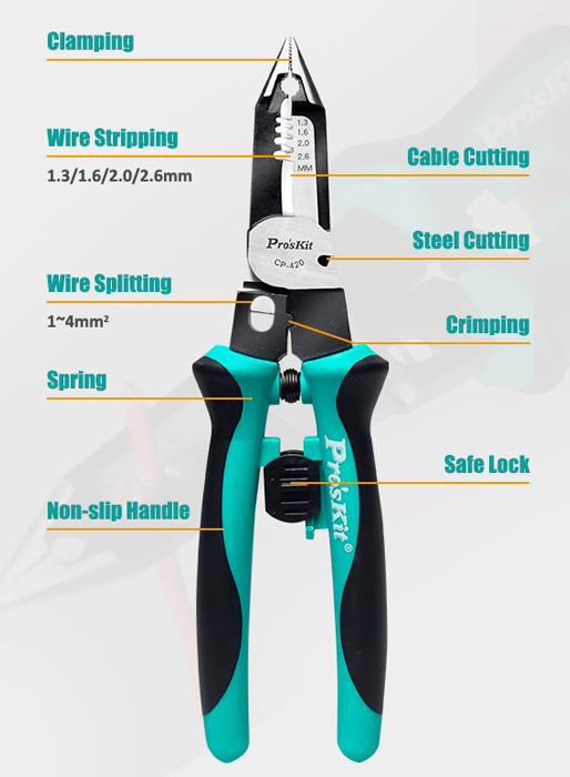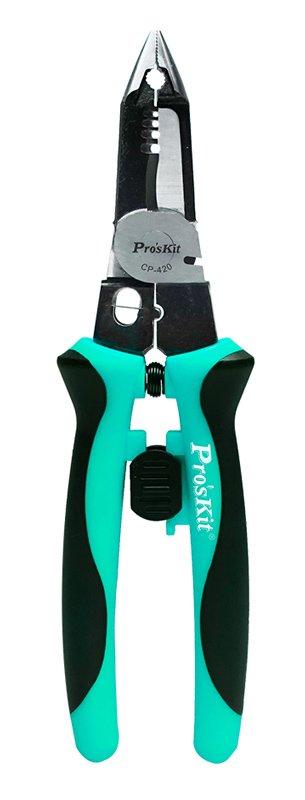 Πολυλειτουργική πένσα της PROSKIT, κατάλληλη για την απογύμνωση και διαχωρισμό καλωδίων, κοπή συρμάτων, πτύχωση τερματικών και σύσφιξη παξιμαδιών.
