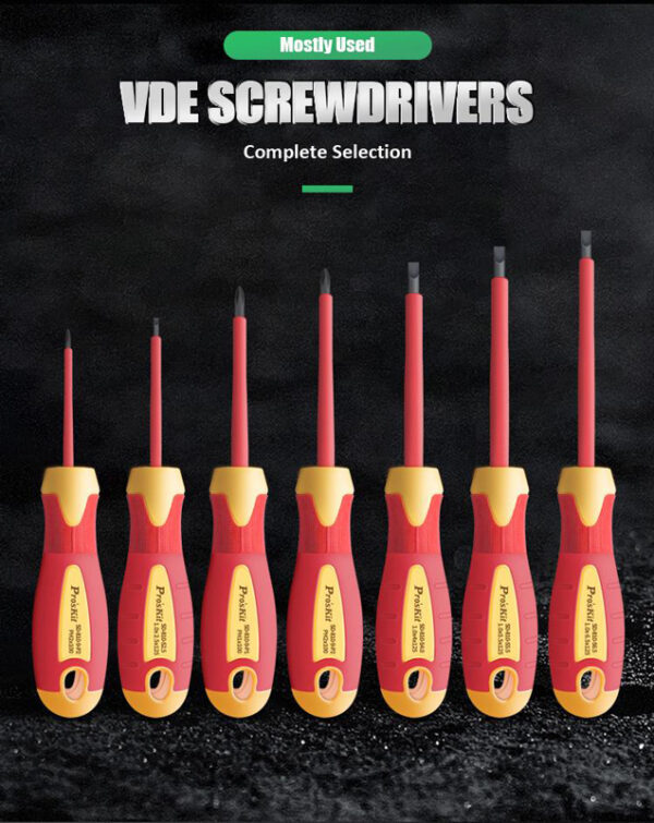 Σετ εργαλείων ηλεκτρολόγου της PROSKIT το οποίο αποτελείται από 7 κατσαβίδια (με μαγνητική μύτη), 2 μυτοτσίμπιδα, 1 πένσα και 1 πλαγιοκόφτη με μόνωση 1000V.