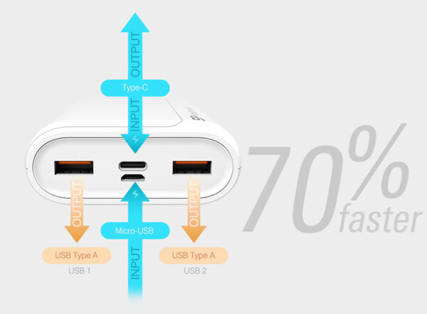 Με το power bank QS15 της Silicon Power το άγχος της εξαντλημένης μπαταρίας θα είναι παρελθόν. Η μπαταρία μεγάλης χωρητικότητας 20.000mAh, είναι σε θέση να φορτίσει το smartphone σας ή όποια άλλη συμβατή συσκευή, 4-6 φορές με μια μόνο φόρτιση. Διαθέτει 2 θύρες εξόδου USB και 1 θύρα εξόδου/εισόδου USB Type-C (PD) με συνολική απόδοση έως 18W. Επιπλέον, εξοπλίζεται με 4 LEDS indicators για την ένδειξη της μπαταρίας και φορτίζει μέσω θύρας USB Type-C ή Micro USB.