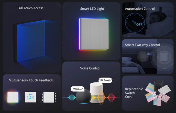 Διαθέτει 2 πλήκτρα αφής για χρήση ως συμβατικός διακόπτης και κομψό LED φωτισμό για να γίνεται εύκολα ορατός στο σκοτάδι.