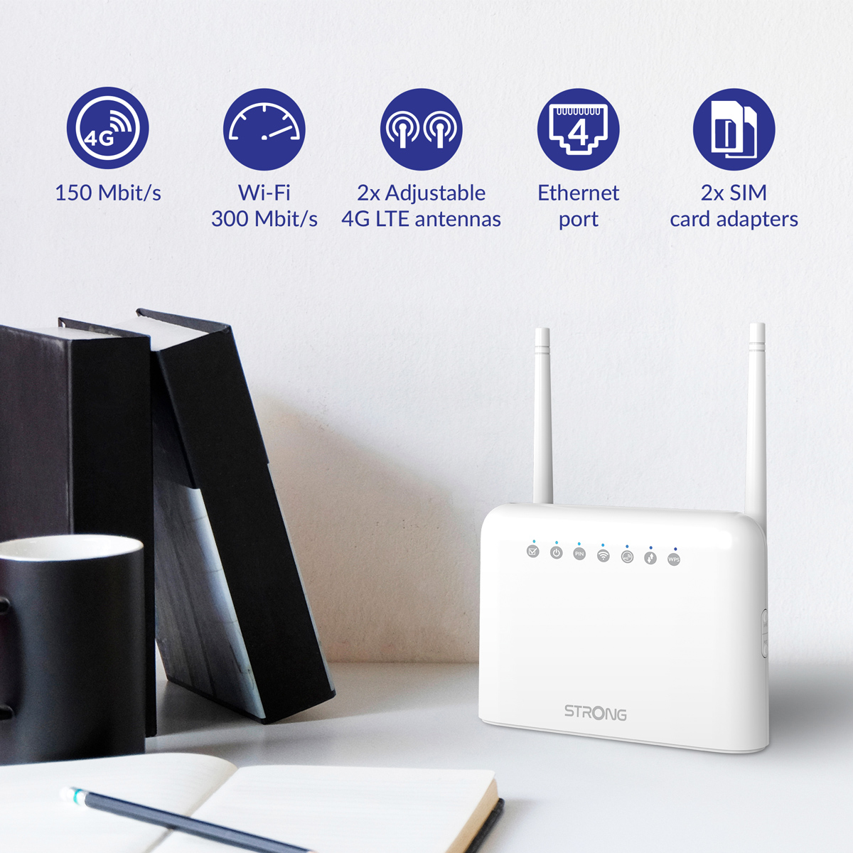 Το router της STRONG σας επιτρέπει να μοιράζεστε μέσω κάρτας SIM, ασύρματο δίκτυο κινητής τηλεφωνίας 4G, με ταχύτητα έως 150 Mbps.