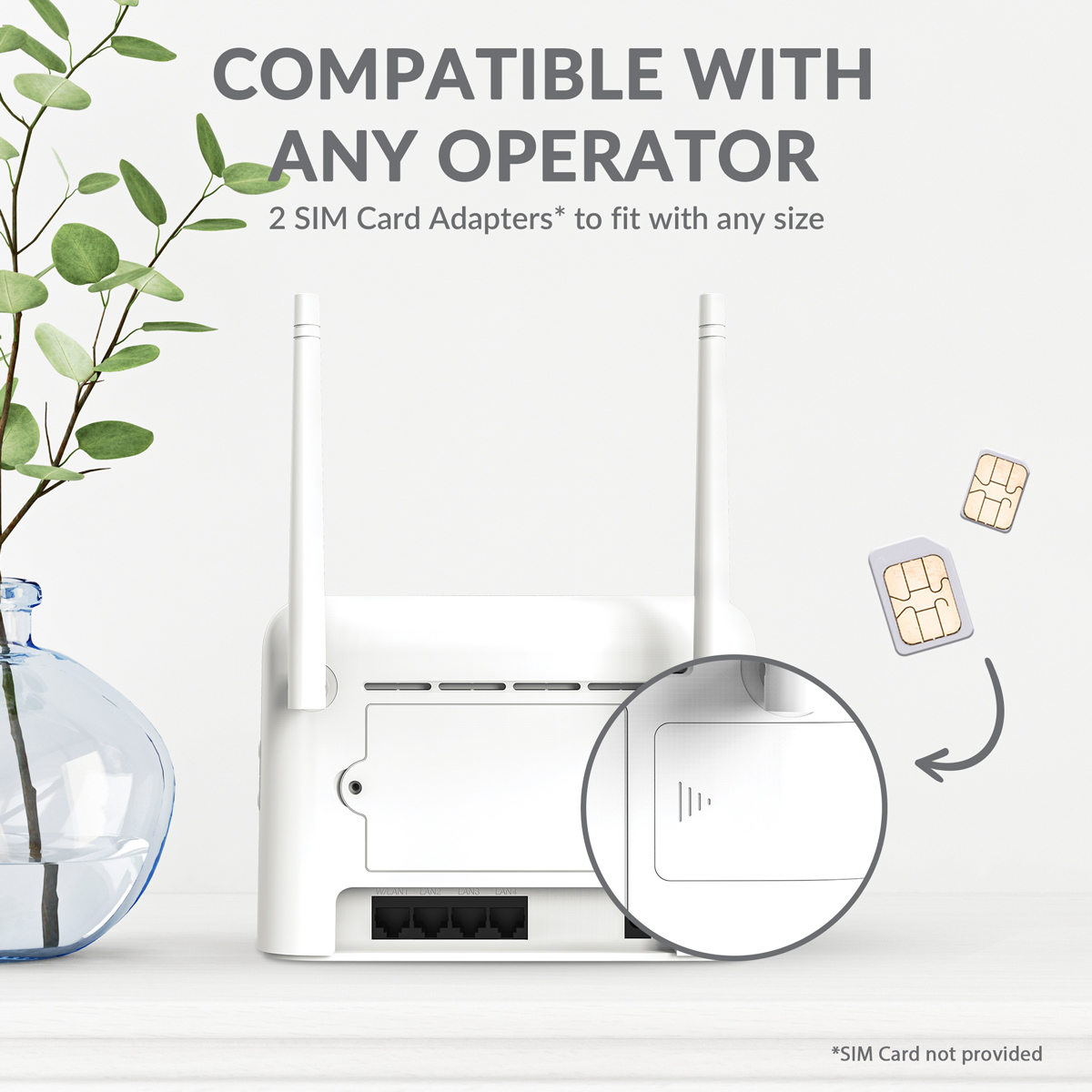 Έκτος από το δίκτυο κινητής τηλεφωνίας 4G, μπορείτε να μοιράζεστε και το οικιακό σας δίκτυο WiFi με ταχύτητες έως 300 Mbps, ενώ, εξοπλίζεται και με 4 θύρες δικτύου για ενσύρματη σύνδεση με ταχύτητες έως 100 Mbps.