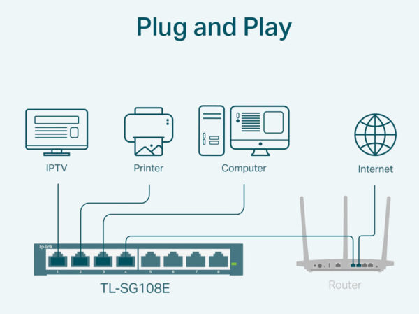 Το easy smart switch της TP-LINK είναι η ιδανική επιλογή για να επεκτείνετε τις θύρες δικτύου Gigabit, στο σπίτι ή το γραφείο, με 8 θύρες RJ45. Διαθέτει κομψό μεταλλικό περίβλημα και πράσινη τεχνολογία για την μείωση της κατανάλωσης ενέργειας.