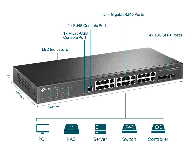 Interface: 24x 10/100/1000 Mbps RJ45 Ports, 4x 10G SFP+ Slots, 1x RJ45 Console Port, 1x Micro-USB Console Port