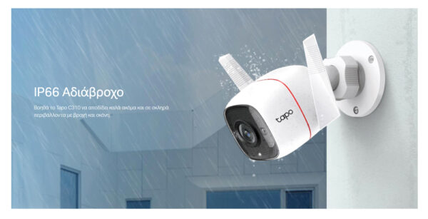 Η Wi-Fi εξωτερική κάμερα ασφαλείας TAPO-C310 της TP-LINK, καταγράφει κάθε κίνηση σε καθαρή, HD ανάλυση, ακόμη και κατά την διάρκεια της νύχτας. Υποστηρίζει την τεχνολογία Motion Detection και Notifications, με την οποία ανιχνεύει κάθε κίνηση και ειδοποιεί με μήνυμα. Εξοπλίζεται με ηχείο και μικρόφωνο, επιτρέποντας την αμφίδρομη επικοινωνία με τα άτομα που βρίσκονται στον χώρο και έχει λειτουργία εκφοβισμού ανεπιθύμητων επισκεπτών με φως και ήχο. Έχει τη δυνατότητα αποθήκευσης αρχείων έως 128GB, σε κάρτα SD (δεν συμπεριλαμβάνεται), που ισοδυναμεί με 384 ώρες (16 μέρες) καταγραφής. Ρυθμίζεται εύκολα και ελέγχεται μέσω της δωρεάν εφαρμογής Tapo.