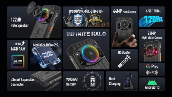 Ενσωματώνει μεγάλο ηχείο διαμέτρου 36mm που προσφέρει δυνατό και καθαρό ήχο για να ακούτε την αγαπημένη σας μουσική όπου και αν βρίσκεστε. Διαθέτει ring light Infinite Halo περιμετρικά του ηχείου, εξοπλισμένο με 18 RGB LED και διαφορετικά modes φωτισμού ανάλογα με τις λειτουργίες του smartphone.