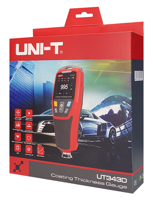 Ο ψηφιακός μετρητής πάχους επίστρωσης χρώματος UT343D μπορεί να μετρήσει το πάχος επίστρωσης σε μεταλλικά υλικά. Αυτή η συσκευή έχει σχεδιαστεί με μια μοναδική λειτουργία γρήγορης δοκιμής, η οποία επιτρέπει στους χρήστες να ρυθμίζουν το εύρος πάχους και να χρησιμοποιούν ένα συναγερμό 3 χρωμάτων LED και ήχου για να προσδιορίζουν γρήγορα εάν η επίστρωση που δοκιμάζεται εμπίπτει στο προκαθορισμένο εύρος, αυξάνοντας σημαντικά την αποτελεσματικότητα της εργασίας. Η οθόνη UT343 είναι αυτόματα περιστρεφόμενη. Αυτή η πιστοποιημένη συσκευή CE μπορεί να αποθηκεύσει έως και 500 σύνολα δεδομένων.
