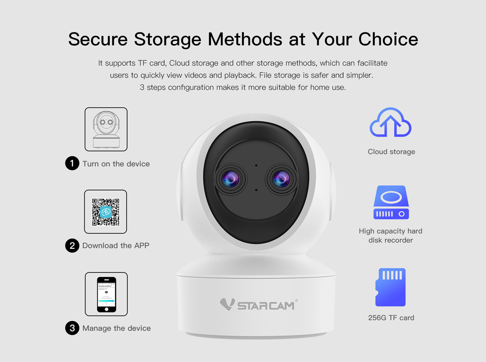 -Storage: Supports TF card (max 256GB), Cloud Storage, NVR, NAS